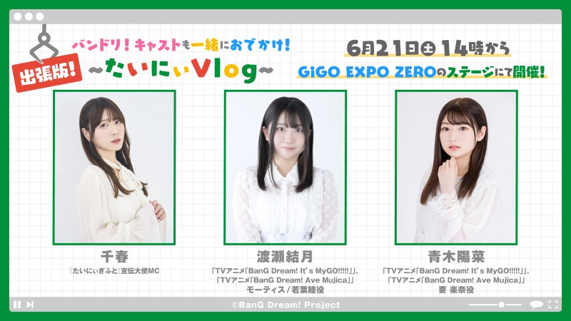 観覧申込対象のステージとして、6月21日にはYouTube「ブシロードクリエイティブ公式」にて毎月生配信中の「千春とどこ行く?~たいにぃVlog~」の出張版が登場。声優の千春と『バンドリ!』キャストの青木陽菜、渡瀬結月が「おでかけ」をテーマに対決しながら、ミニクレーン向け景品ブランド「たいにぃぎふと」のバンドリ!商品を紹介します。