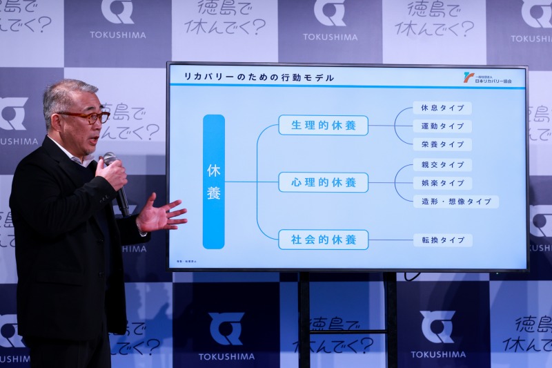 トークセッションではこの4人にくわえて、「休養学」の著書を執筆している片野氏も登壇し、休養学の視点から考える「徳島県の休み方」が紹介された。片野氏は休養には大きく分けて「生理的休養(休息、運動タイプなど)」「心理的休養(親交、娯楽タイプなど)」「社会的休養(転換タイプ)」の3つがあると説明。