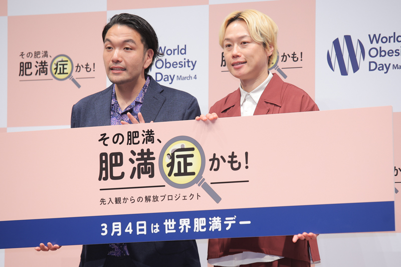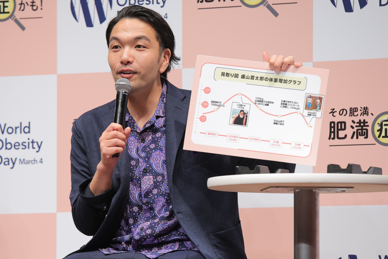 お笑いコンビ・見取り図の盛山晋太郎が3月3日、都内で行われた「その肥満、肥満症かも!」プロジェクト発表記者会見に、リリーとともに登壇。体重が100kgを超えていた時期の生活を振り返った。