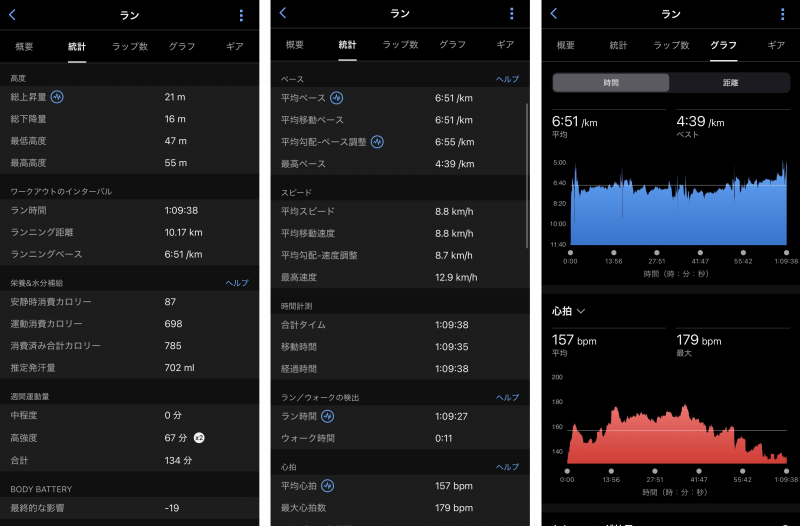 周回系の10kmは、ペース管理の良し悪しがログに出やすい。同データでも、7kmで一度ペースが落ちた後、10km目は6:11/kmまで上がっている。こうした波を見て次の課題に落とすところまで含めて、Garminが得意とする世界観が体験しやすい。