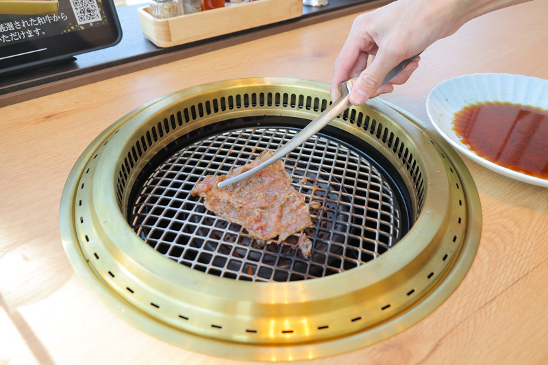 推奨の焼き加減はミディアムレア。スタッフが網の上で手際よく焼いていくと、わずか1分ほどで表面にきれいな焼き色がつき、あっという間に食べ頃の状態になる。皿に置かれたミルフィーユロースをつけダレにくぐらせて頬張ると、層の間に閉じ込められていた肉汁が一気にあふれ、舌の上でとろけるように消えていく。