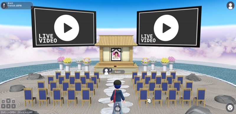 日本庭園をイメージした空間から葬儀会館を模したイベントスペースへと進み、映像や焼香機能を通じて、実際の葬儀に近い体験ができる。アバターを操作し「風ノ間」に入ると、会場ではLIVE映像が流れ、椅子に座って参列したり祭壇の前で焼香と献花もすることができる。こうしたアバターを通じた細かな所作によって、物理的には会場から離れていながらも、葬儀の場や故人とのつながりを意識できる印象を受けた。