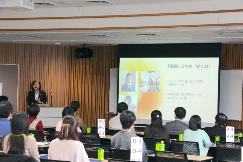 イベントは、参加者の緊張をほぐすためのミニセミナーからスタート。講師から「第一印象を55%で終わらせない技術」が伝授された。