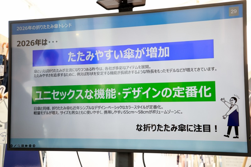 また、晴雨兼用も含めたストレスフリーな「折りたたみ傘」も紹介。2026年の折りたたみ傘のトレンドとしては、「たたみやすい傘が増加」「ユニセックスな機能・デザインの定番化」という二つの特徴があるとのこと。