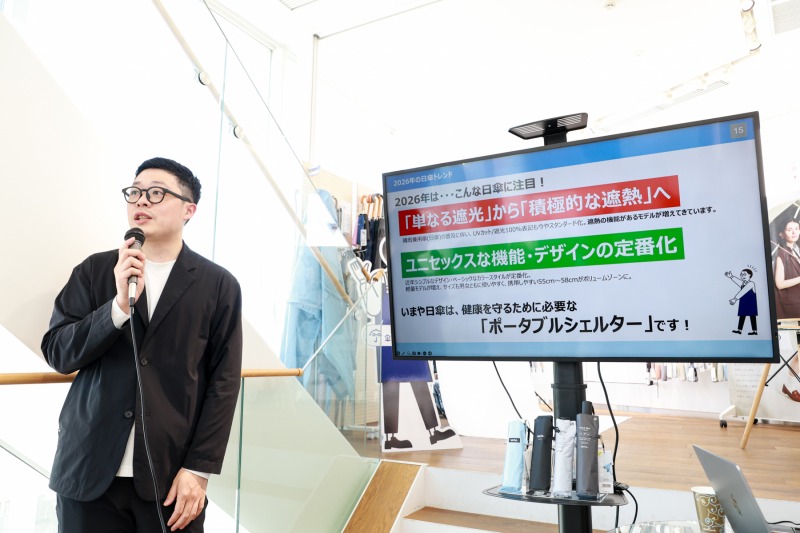 そして、2026年の日傘トレンドとして、「『単なる遮光』から『積極的遮熱』へ」と「ユニセックスな機能・デザインの定番化」という二つの注目ポイントが挙げられた。土屋氏は「今もう日傘は、健康を守るために必要な『対策』というよりも『防衛』になるのではと思い、『ポータブルシェルター』と呼ぶのが相応しいです」と、健康を守るための日傘の新たな見方を提案した。