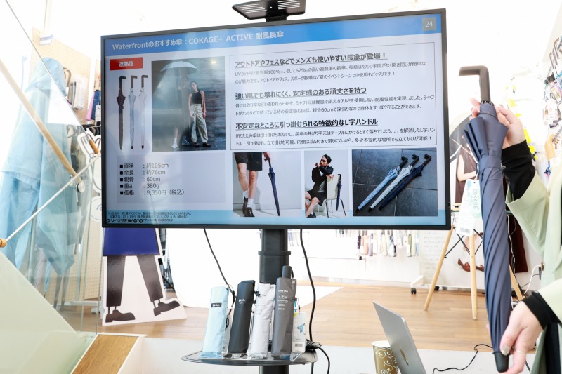また、Waterfrontの日傘の売れ行きとしては、市場の拡大に伴い、同社の日傘の売上シェアも拡大し、商品ラインナップも日傘の割合が増加している。機能面では、UVカット率だけでなく、遮熱性能や耐風性能、携帯性などのプラスアルファがあるものが人気だという。