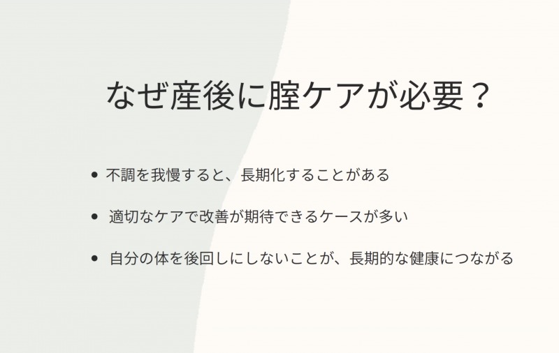 女性ホルモンの低下により腟は乾燥しやすく、組織や筋肉も硬くなりやすい状態にあるほか、骨盤底筋のゆるみは尿漏れの原因となり、出産回数が多いほどリスクも高まる。しかし、「そのうち治る」「産後だから仕方ない」と不調を我慢し、誰にも相談できずに抱え込んでしまうケースが多いのが現状だ。