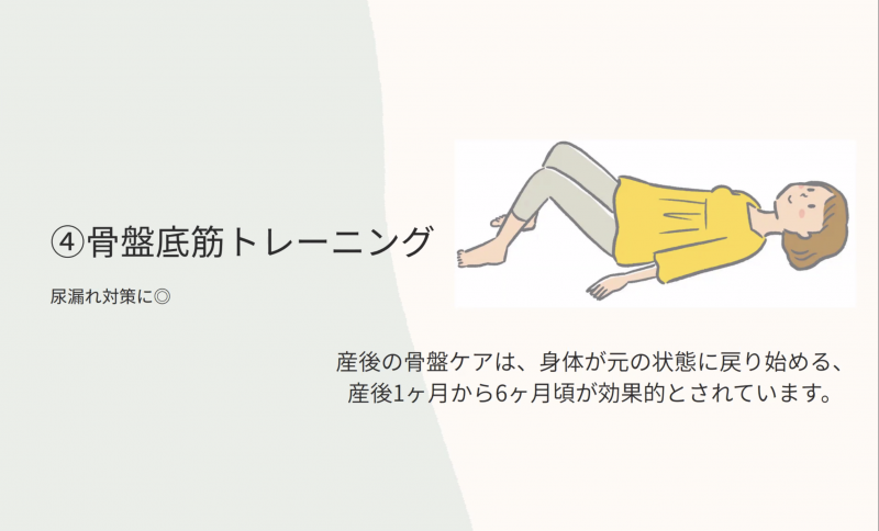 尿漏れや入浴時のお湯漏れに対して「無理にスクワットなどを行うと逆に漏れてしまうことがあります。まずは骨盤底筋トレーニングから始めてください。半年以上続けても改善しない場合は受診をおすすめします」とのこと。