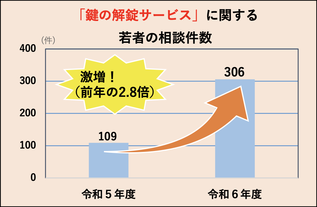 解錠、トイレのつまり、水漏れ、など緊急事態に陥っている状況につけ込み、広告で安い料金をうたい、来訪後には高額な料金を請求する商法。解錠サービスに関する若者の相談は前年度の約2.8倍に。