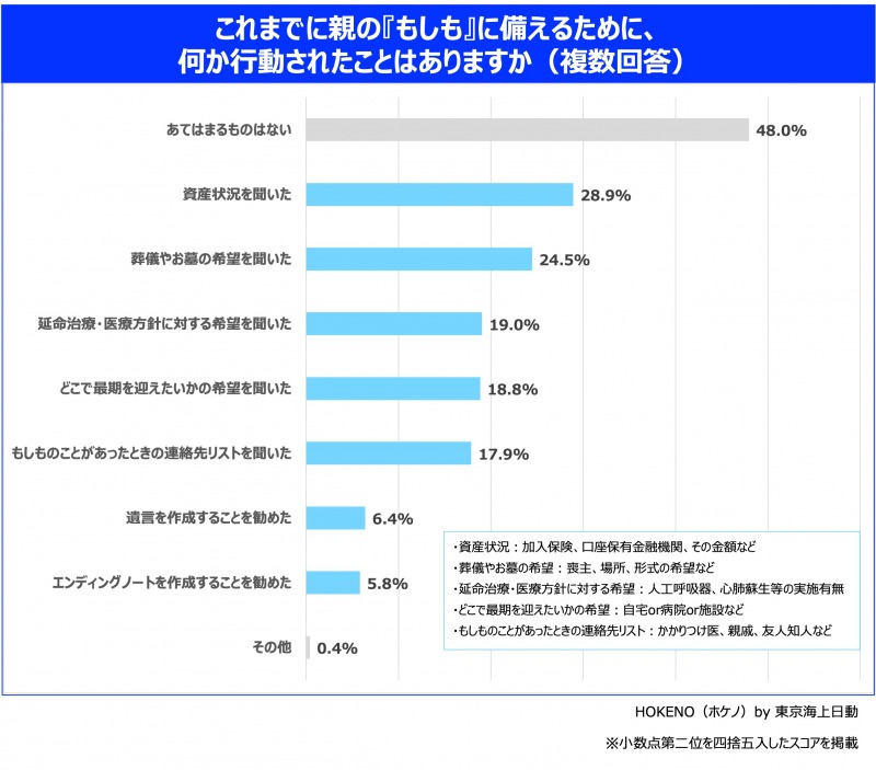 しかし、備えのために何か⾏動したことがあるかという質問では、「あてはまるものはない 」が約半数となり、「資産状況を聞いた」、「葬儀やお墓の希望を聞いた」などの回答は3割未満に留まる結果に。その他もそれぞれ2割弱となっており、備えが重要と思いつつも詳細な準備まではしておらず、先送りにしてしまっている人も多いようです。