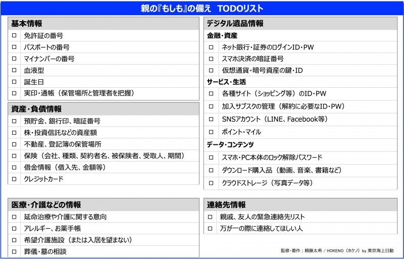 お⾦のことを聞くのは難しいもの。重要なのは「⾃分が遺された時にどうなるか」という⼦の視点を親に正直に伝えることです。相続のことも決めておかないと後々に遺族の中で争いの元になりますし、どこにいくら資産があるのか残された側が把握していなければ、時間と⼿間がかかります。親世代に対し「⼦がどのような状況に置かれるか」を想像してもらい、終活を⾃分ごととして捉えてもらう働きかけが有効です。以下のようなTODOリストを⼀緒に埋めていくことから始めてみましょう。