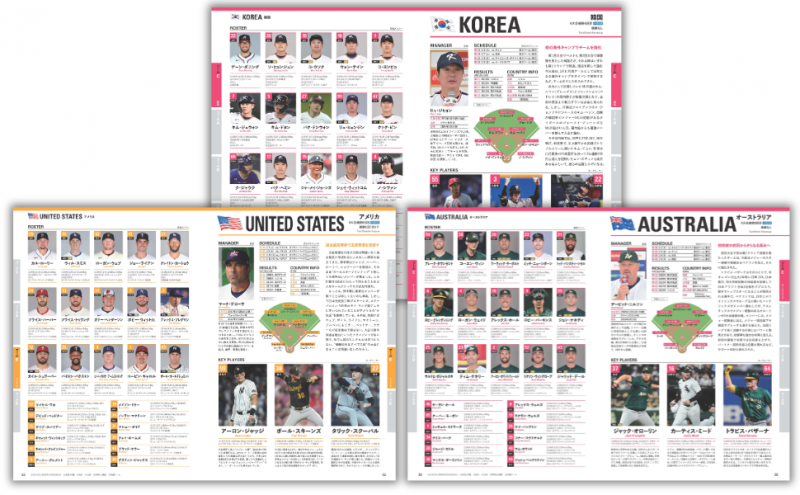 さらに、アーロン・ジャッジ選手や、ブラディミール・ゲレーロJr.選手など、MLBを代表するスーパースターたちも紹介。プールCで日本と対戦するオーストラリアや韓国、準々決勝以降のラウンドで対戦する可能性のあるドミニカ共和国、ベネズエラ、アメリカなどの強豪国の選手名鑑も掲載し、大会をよりいっそう楽しめる内容となっています。