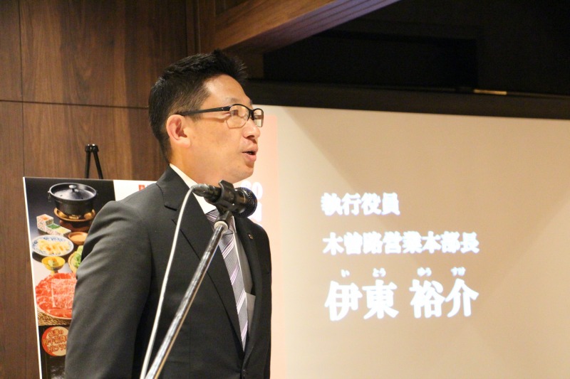 続いて、伊東裕介執行役員・営業本部長より、具体的なアニバーサリー施策が発表された。中でも注目を集めたのが、「木曽路のごちそうしゃぶしゃぶ サンキューコース」である。