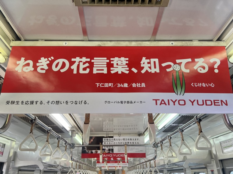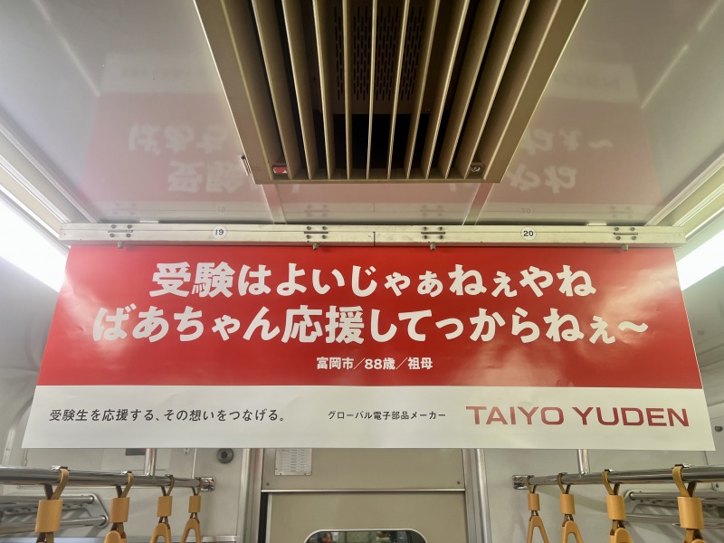 群馬県内に主要拠点を置く大手電子部品メーカーの太陽誘電が、受験生を応援するユニークな電車内広告を掲出したことが話題になっています。「街の人たち」から集めた応援メッセージを掲載したもので、高崎市周辺の電車で一面に掲出されています。