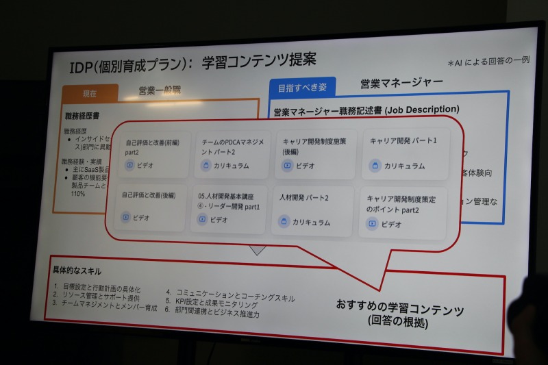 また、個人のキャリア志向や経験年数をもとに、AIが「個別育成プラン(IDP)」を提案する機能も用意されている。現時点ではチャット形式で提供されているが、今後は専用UIの実装も予定されており、より直感的な操作が可能になるという。