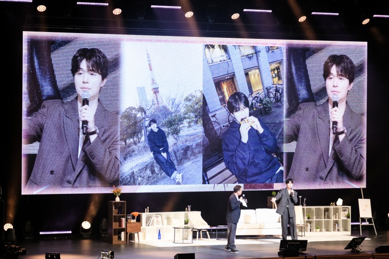 さらに、最近の未公開写真を映し出しながら、来⽇中に⾷べたものや⽇本のコンビニでのお気に⼊りアイテム、普段のリラックスした過ごし⽅など、等⾝⼤のイ・ドンウクがうかがえるエピソードを披露。もんじゃ焼きを作っている動画もあり「チャンスあれば、皆さんのためにも作ってあげたい」と呼びかけると、会場からは⼤きな拍⼿が起こりました。