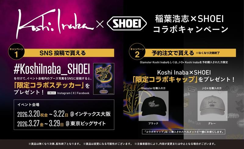 また、会場および予約注文でキャンペーンを実施。イベント会場内のブース写真をハッシュタグとともに投稿すると「限定コラボステッカー」がもらえるSNSキャンペーンが展開されるほか、コラボヘルメットの予約注文で「限定コラボキャップ」(なくなり次第終了)がプレゼントされる企画も用意されている。