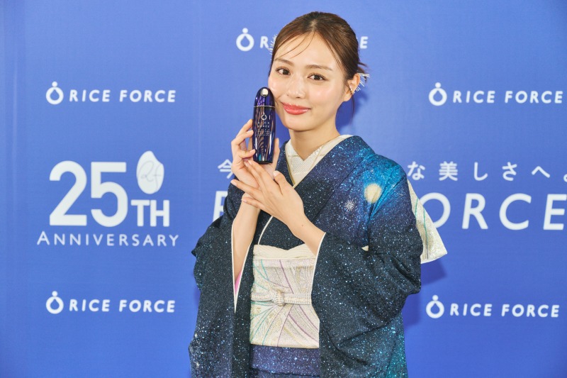 続けて、内田理央さんがライスフォースのブランドカラーである青色の着物姿で登場。『Thanks Rice』の1日店長就任にあたり、内田さんは「私のお母さんが、ライスフォースの化粧水が人生で一番好きで、今回のイベントに登壇することを喜んでくれました!」と心温まるエピソードを披露しました。