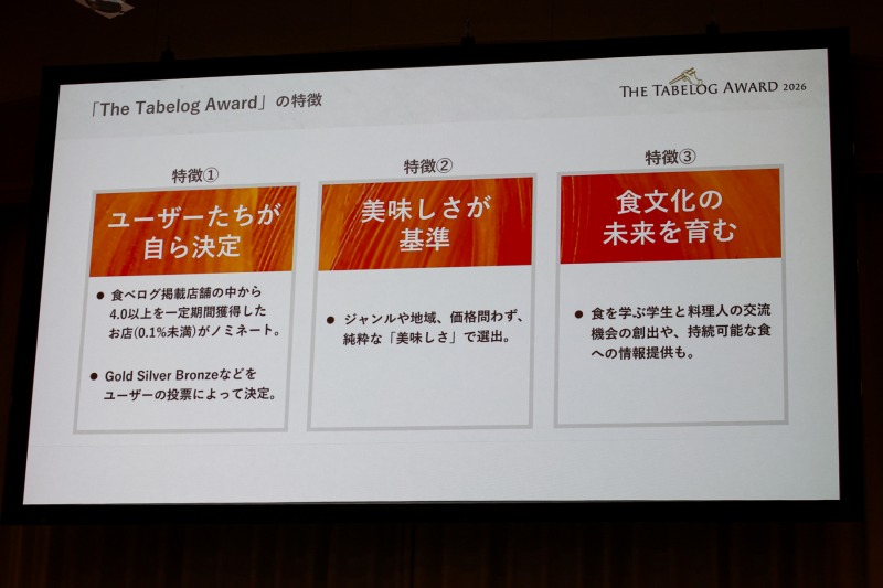 株式会社カカクコムが運営するレストラン検索・予約サービス「食べログ」は、2026年1月26日(月)、ユーザーの投票により、日本が誇る「美味しい」お店を選出する「The Tabelog Award 2026(食べログアワード 2026)」を発表。その授賞式に先駆けて、プレス向け発表会が行われた。