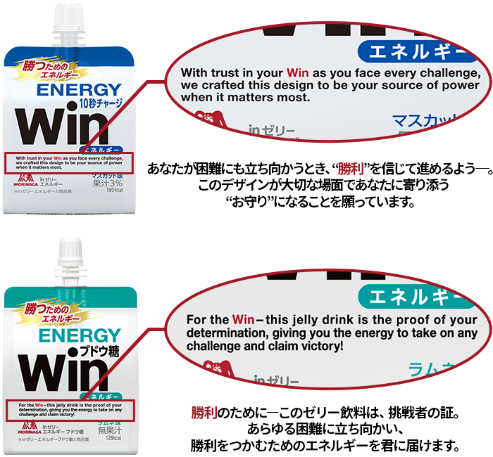 また、同社は受験や部活などの勝負どころに挑む人たちを応援する取り組みとして、縁起のいいパッケージとなった「inゼリーエネルギー<Win>」「inゼリーエネルギーブドウ糖<Win>」を昨年に続き期間限定で販売。「受験などの勝負ごとで、いつも隣にいる相棒でありたい、お守りのような存在でいたい」という想いが込められており、商品名の下のコピーも応援メッセージになっています。