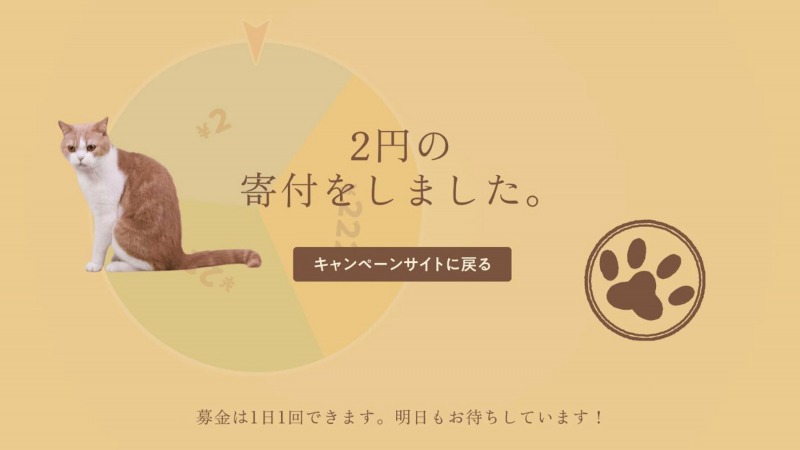 リアルイベントとともに、スマートフォンで参加できる「猫パンチで募金」が2月16日(月)~2月23日(月)の期間で実施される。こちらは、専用サイトにスマートフォンやタブレットからアクセスし、飼っている猫のお名前を入力するとルーレットが現れる。ルーレットを猫パンチ(タップ)で止めると金額が表示され、その金額がイエローハットから保護猫・動物保護団体へ寄付される。