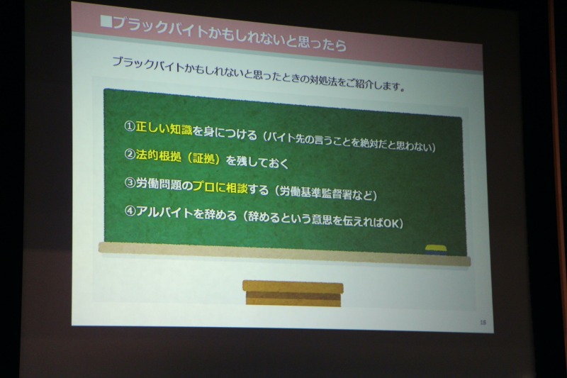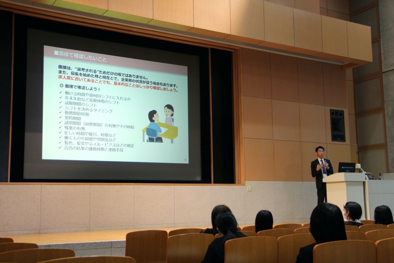 セミナーでは、労働法の基本についても説明。アルバイトであっても労働者として保護される権利があり、最低賃金や労働条件の明示が義務付けられている。トラブルが発生した際には、証拠を残し、大学や専門機関に相談することが重要だとされた。