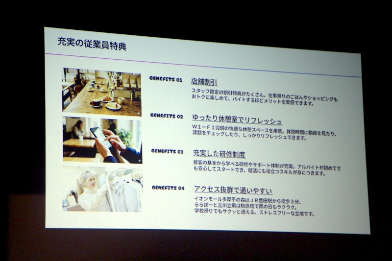 ミニセミナーに続いて行われたのは、三井不動産商業マネジメントによるプレゼンテーションだ。ここでは、ショッピングセンターで働く魅力と、今回のプロジェクトの背景が説明された。