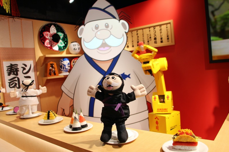 1階は「グリーティングフロア」。板前姿のDr. Simiが出迎える寿司カウンターなど、日本文化を取り入れた展示が並ぶ。