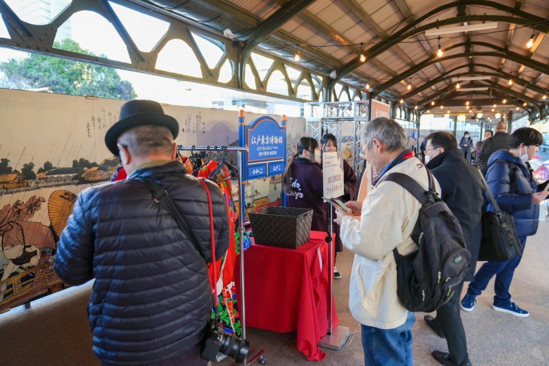 JR両国駅3番線ホームで始まった「江戸東京博物館リニューアルオープン100日前記念イベント」では、鴨南蛮の振る舞いや和傘を使ったイルミネーション、江戸と令和の文化・慣習の見比べ展示などを実施。江戸の風情を体感することができる催しが満載となっています。