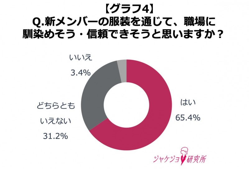 また、「服装を通じて、この人は職場に馴染めそう・信頼できそうと思うか」を尋ねたところ、全体の約6割以上が「はい」(65.4%)と回答しました。この結果から、服装が相手に与える印象や信頼感に大きく影響していることもうかがえます。