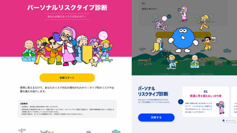 保険総合ポータルサイト「HOKENO」では、質問に直感的に答えるだけで、お⾦や保険に関する自身の価値観やリスク対応の傾向がわかる「パーソナルリスクタイプ診断」を提供。夫婦で診断結果を共有することで互いの考え⽅を理解することに役立ちます。