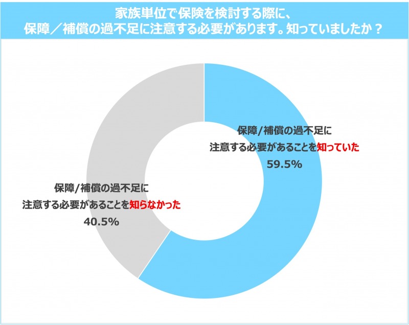 また、家族単位で保険を検討する際、保障/補償の過不⾜(例︓夫婦で⼆重加⼊している、または必要な保障/補償がどちらも未加⼊など) に注意が必要だと知っている⼈は約6割近くに。しかし、実際に⾃分とパートナーの保険内容を確認したことがある⼈は、半数以下にとどまりました。