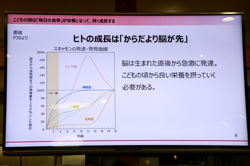 「こどもの脳は『毎日の食事』が栄養となって、賢く成長する」というテーマについて、小山氏はまず「ヒトの成長は『からだより脳が先』」であり、脳は生まれた直後から急激に発達し、こどもの頃から良い栄養を摂る必要性を説いた。生まれてから5歳までの間が、脳が一番大きく成長する時期で、この時期に体をつくるための栄養を、こどもに十分に与えることが大事だという。