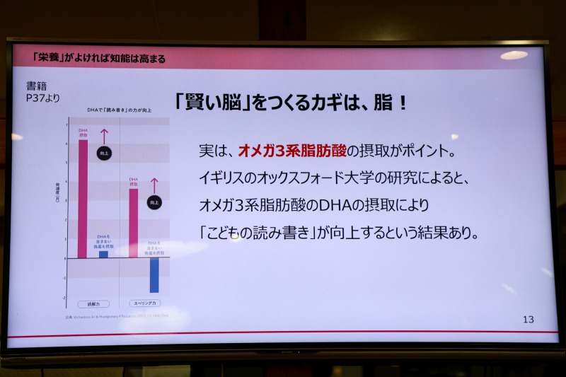 そして、こどもの「賢い脳」をつくるカギは脂である、と小山氏は説明。イギリスのオックスフォード大学の研究によると、オメガ3系脂肪酸のDHAの摂取により、「こどもの読み書き」が向上するという結果が出ている。