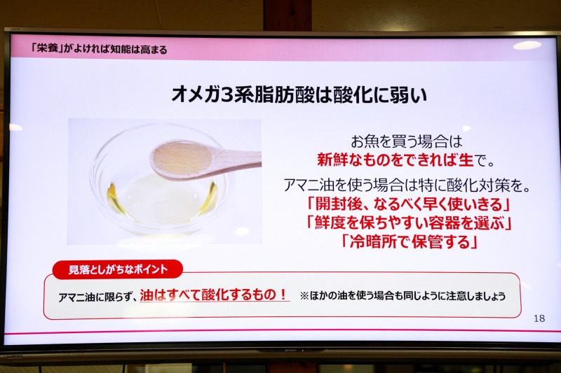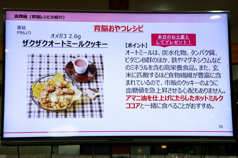 セミナー後半では、実践編として複数の育脳食べ合わせメソッドや書籍『「賢い脳」は脂が9割 地頭のよい子をつくる』で公開されている育脳レシピの一部が紹介された。セミナーでは、育脳おやつレシピの栄養価豊富な「ザクザクオートミールクッキー」や主菜になる魚レシピの「まぐろのアマポン酢づけ丼」、10分でできる育脳朝ごはんの「魚肉ソーセージドッグ」「枝豆としらすのおにぎり」などのレシピとともに、いかにオメガ3系脂肪酸のDHAが豊富かなどが伝えられた。