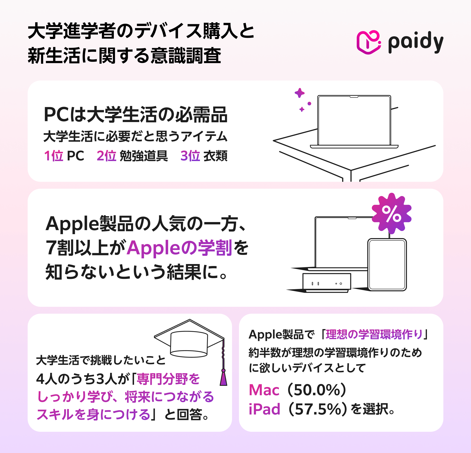 この結果を受けて、同社は「1⽉29⽇(⽊)から4⽉8⽇(⽔)まで期間限定で実施されるAppleの⾼等教育機関向けキャンペーンでは、対象のMacまたはiPadを学⽣・教職員価格で購⼊すると最⼤24,000円のApple Gift Cardがもらえます。ぜひ、この特別な機会に『ペイディあと払いプランApple専⽤』を利⽤して、MacやiPadを⼿に⼊れてみませんか」と提案しています。