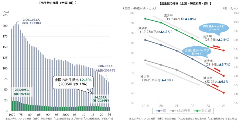 今回、東京都の2024年の 「合計特殊出生率」が発表され、「0.96」と、全国でも唯一1.0を割り込んだ結果に。全国・都ともに2023年から減少し過去最少を記録。しかし、全国は大きく減少しているものの、都の減少ペースにはブレーキがかかる結果となりました。