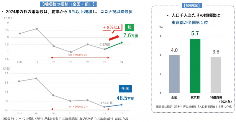 東京都は、「望む人が安心して子供を産み育てられる社会」の実現に向けた政策を展開。少子化問題を取り巻く環境は依然として厳しい中、 都内では出生数の先行指標とも言われる婚姻数が2024年は前年から6%以上増加するなど、明るい兆しも見えてきています。