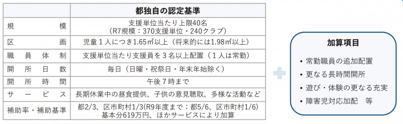 利用者(保護者や子供)がニーズに応じて様々な選択や利用が可能となるよう、都独自の国を上回る運営基準を満たす学童クラブを認証し、運営費等の経費を補助。