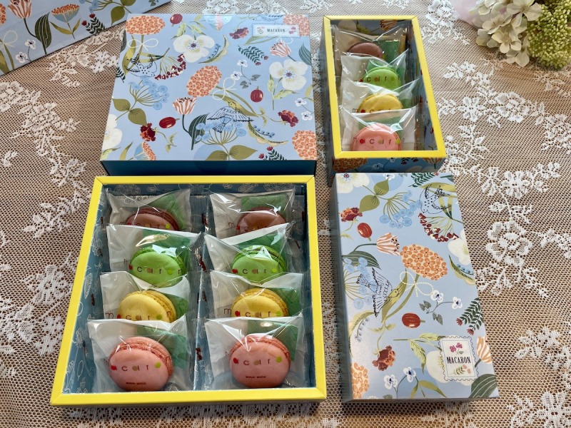 箱を開けた瞬間、思わずかわいい!と声が出るカラフルなマカロン。ピンク色の「フランボワーズ」はきゅんと甘酸っぱく、黄色の「アプリコットバナナ」はフルーティーでまろやか。緑色の「洋梨」はみずみずしい香りが広がり、茶色の「カフェ」はほろ苦さもある大人の味わい。ガナッシュクリームは濃厚で、外側のさっくり感と内側のしっとり感のコントラストが心地よい仕上がりです。春らしい彩りは、ギフトとしての“映え”も間違いなし。