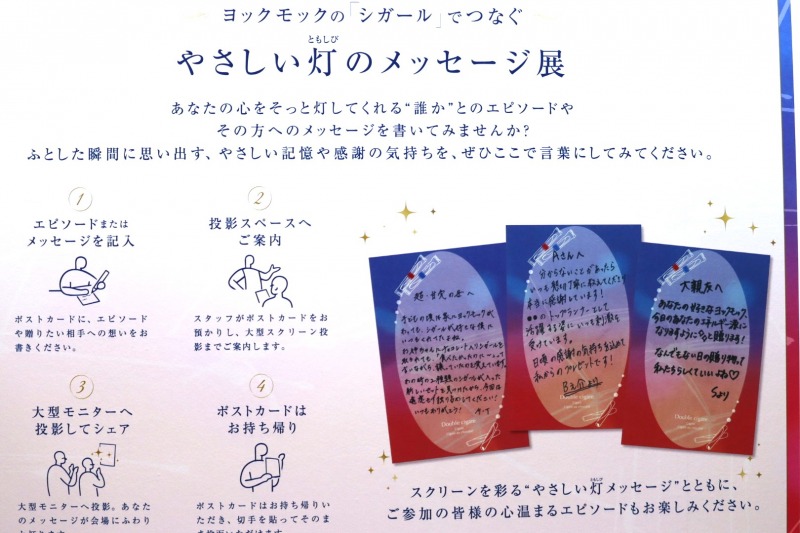 会場には、新商品のパッケージから着想を得た“光”の空間やフォトスポットを設置。来場者は「ドゥーブル シガールを贈りたい相手とのエピソード」をオリジナルはがきに書いて投稿でき、その内容は大型モニターに映し出される。書いたはがきは持ち帰れるほか、実際に投函して相手に届けることも可能だ。