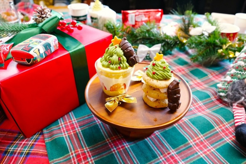 こちらはクッキーやマシュマロを重ねてツリーの形にしたもの。抹茶クリームをデコレーションし、頂上に「ホリデイサンタ」を添えるだけで、まるでパティスリーのような仕上がりに。手軽なのにSNS映えするアレンジです。