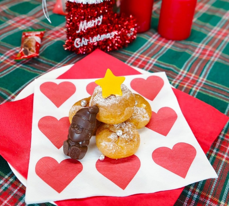 市販のプチシューに粉糖を雪のようにふりかけ、トップに「ホリデイサンタ」を飾れば、おうちで簡単に“ご褒美感”のあるクリスマススイーツに。