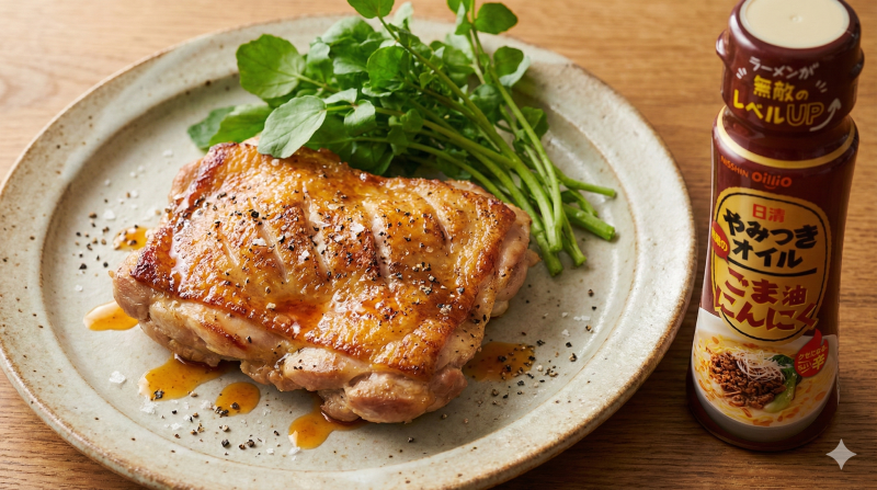 クリスマスディナーにつきもののクリスマスチキンは、「日清やみつきオイル ごま油にんにく」で“ちょい辛”風味に。くせになってやみつきになりますよ。