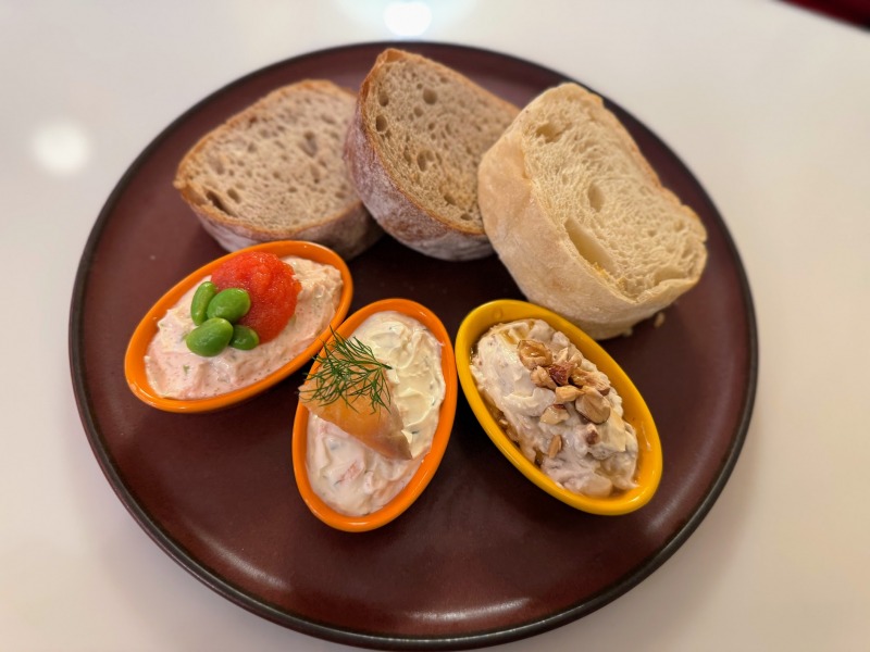 伺った日は明太子と枝豆、スモークサーモンとディル、ドライフルーツとメープルシロップの3種類のディップとなっていました。